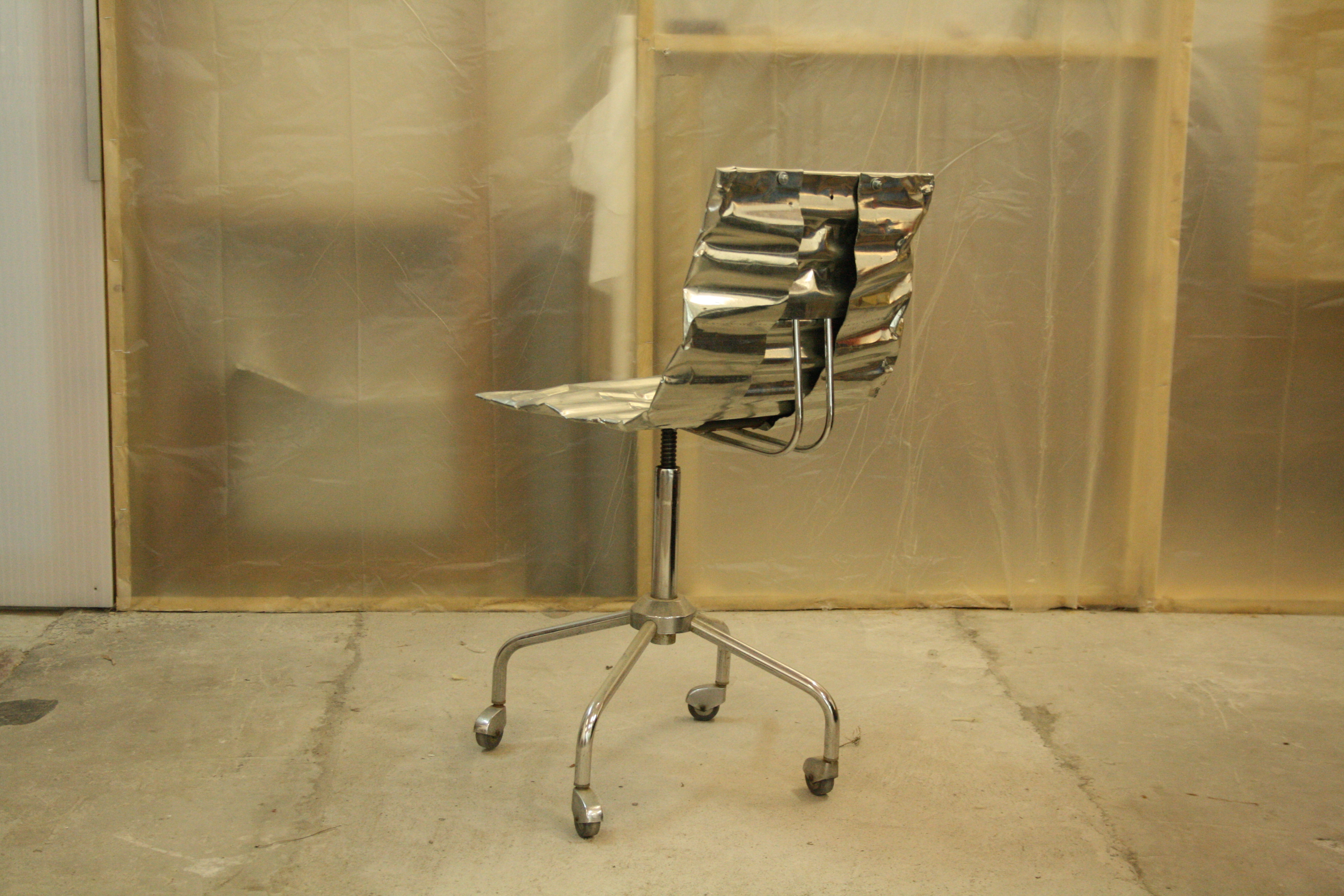 This chair was created by merging materials. The seat consists of a corrugated plate. It was part of a sculpture I made during a residency in Marrakech, Le 18 where I worked mainly with local materials. I later turned the sculpture into an object that now serves as a chair. The bottom piece is a remnant of an old office chair that I found.